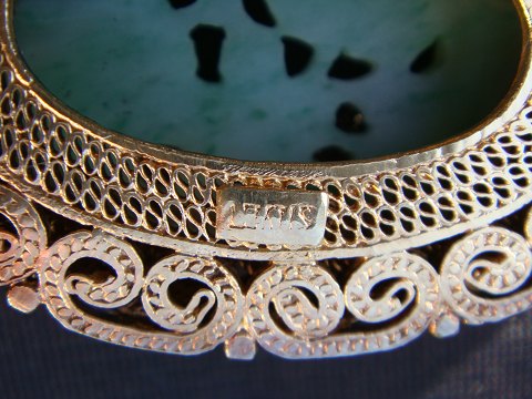 Silver filigree brooch is gold plated with carved Jade SOLD