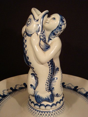 Stort Rundt fiskefad med Dreng står med fisk i midten.