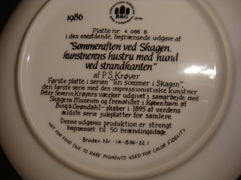 Første platte i serien en sommer aften i skagen, den første serie med impresionisiske kunstner peter serverin krøyers værker. udgivet i samarbejde med skagen museum, og fremstillet i København af Bing & Grøndahl. Skaber i 1895 af verdens ældste serie juleplatter for samler.
