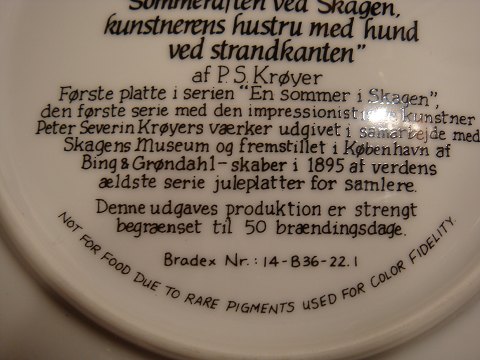 First plate in the series, a summer evening at Skagen, the first series with impresionisiske artist peter Serverin Krøyers works. published in cooperation with the Skagen Museum, and produced in Copenhagen by Bing & Grondahl. Creating in 1895 the world's oldest series of Christmas plates for collectors.