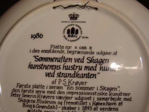 First plate in the series, a summer evening at Skagen, the first series with impresionisiske artist peter Serverin Krøyers works. published in cooperation with the Skagen Museum, and produced in Copenhagen by Bing & Grondahl. Creating in 1895 the world's oldest series of Christmas plates for collectors.