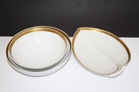 Lyngby, Danmark, Trend 450. Hvidt stel med græsk guldbort. Bladassiet. Længde 24 cm. Bredde 18 cm. Pris: SOLGT Skål. Diameter 18 cm. Højde 7 cm. Pris: SOLGT