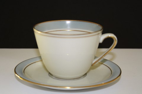Kjøbenhavns Porcellains Maleri, Fredensborg. Designet før 1956. Stellet er elfenbensfarvet og dekoreret med lyseblå kant og mat guldkant.
