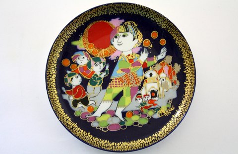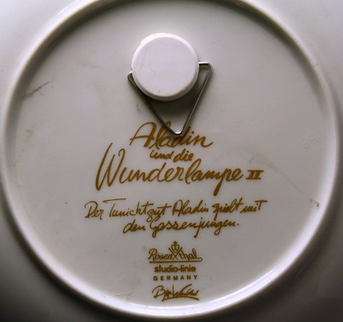 Rosenthal/Studio-Line, samler serie af Bjørn Wiinblad med 12 motiver fra eventyret om Aladin og den vidunderlige lampe. Motiv nr 2: Aladin får appelsinerne i turbanen. Udgivet i 1979 i forbindelse med 100 års jubilæum for Rosentahl. Platterne er koboltblå med forgyldte kanter og motiver. Diameter 16 cm. Pris med originalæske: 200 kr. stk. Lager: 1