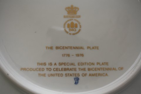 Bing & Grøndahl, smuk platte i anledning af 200 års dagen for USA's uafhængighed. Diameter 23 cm. Inskription på bagsiden The Bicentennial Plate 1776-1976. Special editon. Platten er i originalæske.