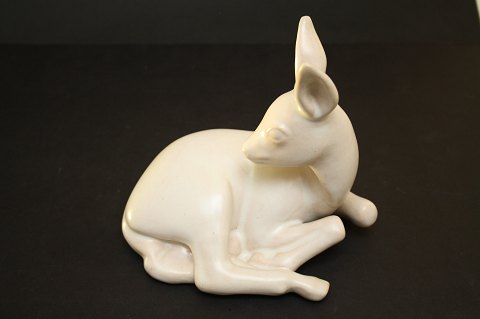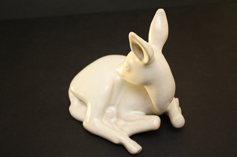 Peder Hald, liggende hjort i hvid mat glasur, ganske svagt krakeleret. Højde 16 cm. Længde 17 cm. Signeret Hald. Peder Hald grundlagde sit eget keramikværksted i Holte i 1942. Pris: 850 kr.