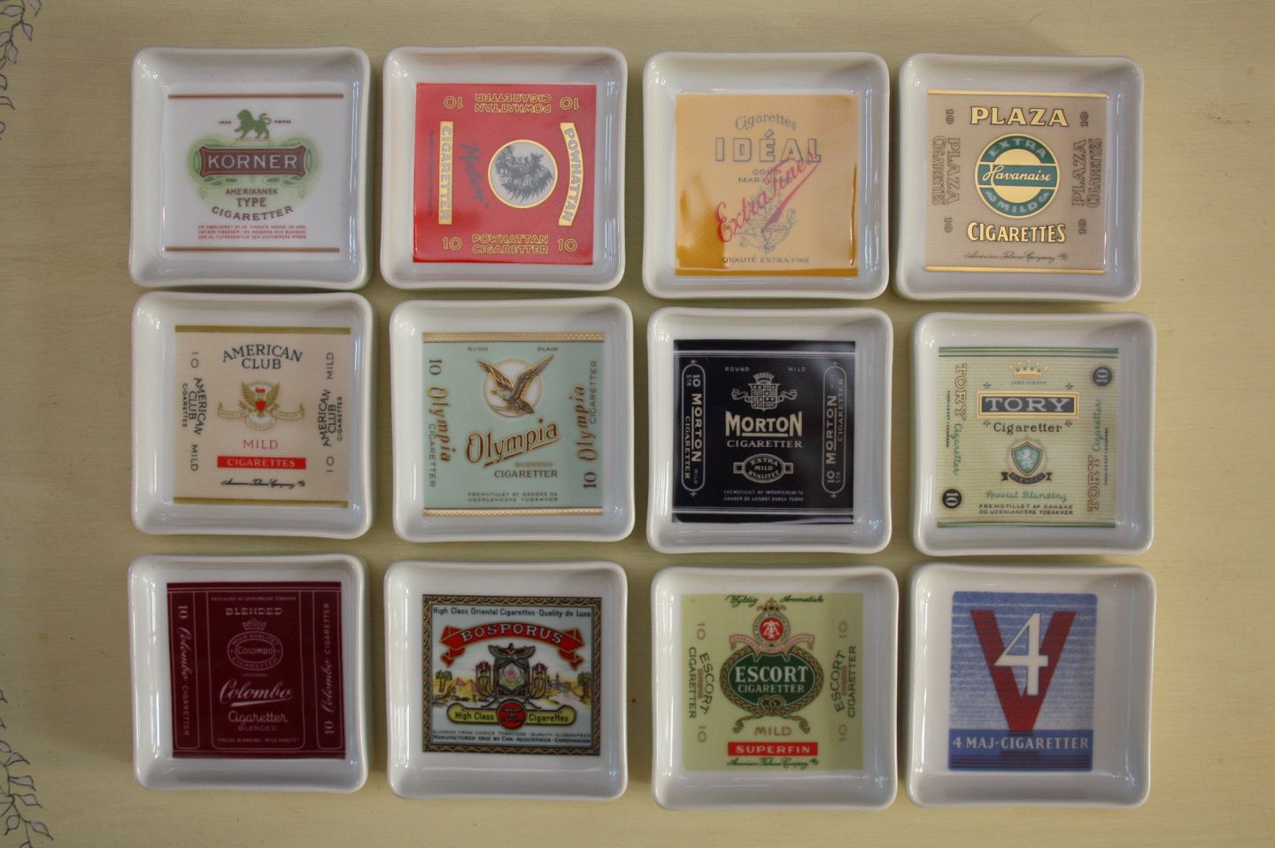 Bing & Grøndahl, Årgangs askebægre med cigaretmærker fra 2. verdenskrig, produceret til Skandinavian Tobacco International, Denmark. Nr. 380. Askebægrene er i originalæske og måler 9,5 x 9,5 cm. Alle i flot stand. Pris: 150 kr. stk.