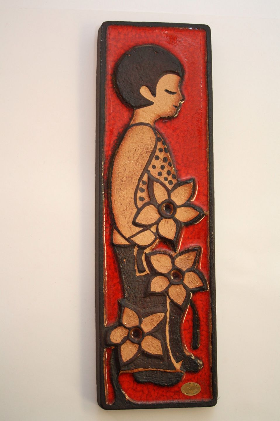Søholm relief med baggrund i rød glasur, motiv barn med blomster