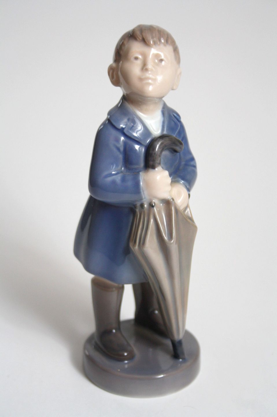 Royal Copenhagen, Dreng med paraply, April fra serien kalenderbørn. Designet af Hans H Hansen. Nr. 4526. Højde 16 cm. I. sortering. Pris: 725 kr. stk. Lager: 2