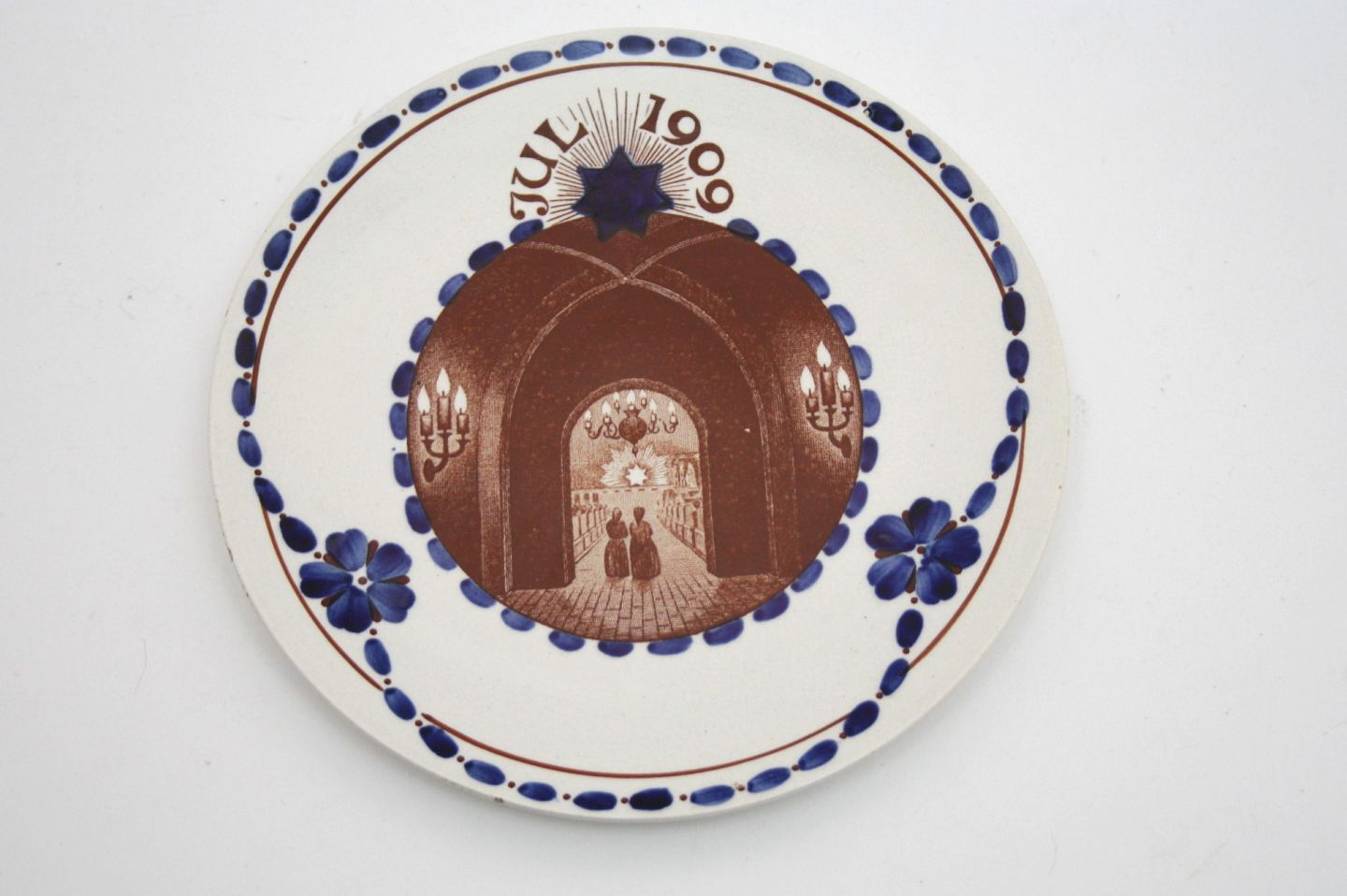 Aluminia, juleplatte 1909. Diameter 16 cm. Flot stand. Pris: 300 kr. stk. Lager: 2