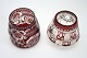 T.h. Krukke/vase med drueklaser og blade. Højde 10,5 cm. Øverste diameter 7,3 cm. Lettere brugsslid. Pris: 450 kr.