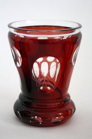 1. Vase med krydsslibninger. Højde 6 cm. Øverste diameter 6 cm. Ujævnheder i kant. Pris: 100 kr.