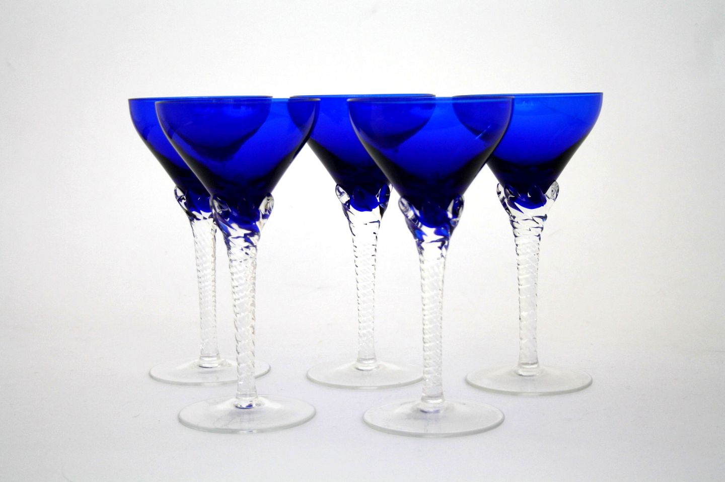 Smukke drinks glas med kongeblå kumme og snoet stilk, højde 15,5 cm. diameter 8 cm. et glas med afslag på foden se ekstra foto. Pris: SOLGT