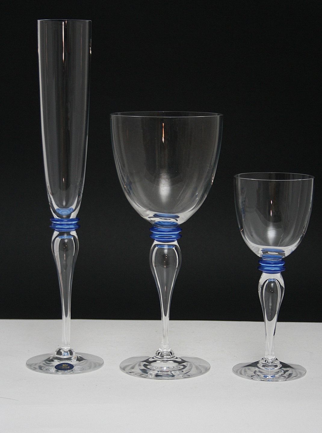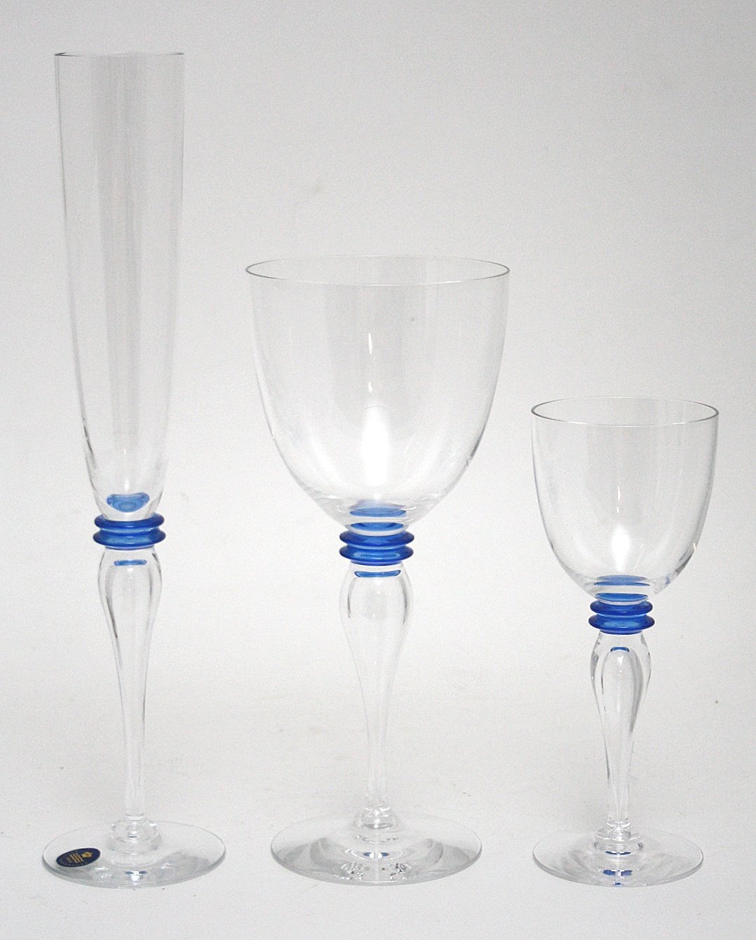 Holmegaard, Attica designet af Anja Kjær i 1989 udgår af produktion i 2002. Klar glas med blå knop. Serien findes også med optiske striber.