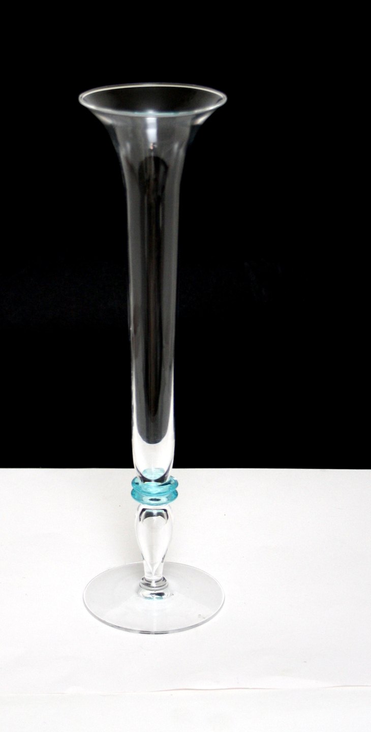 Attica vase, luftfyldt balusterformet stilk, turkis knop, højde 35,7 cm. øverste diameter 7,8 cm. Pris: 225 kr.