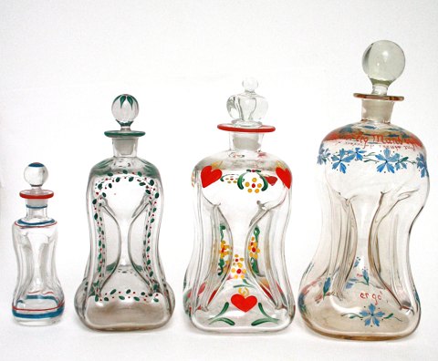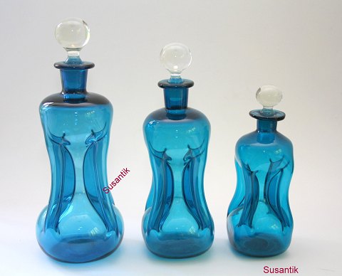 Holmegaard, Klare klukflasker med kugleprop. Fin stand Højde 22,5 cm. Pris: SOLGT Højde 23 cm. Pris: 300 kr. Højde 29 cm. Pris: 350 kr. Højde 31,5 cm. Pris: 400 kr.
