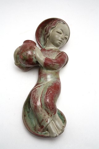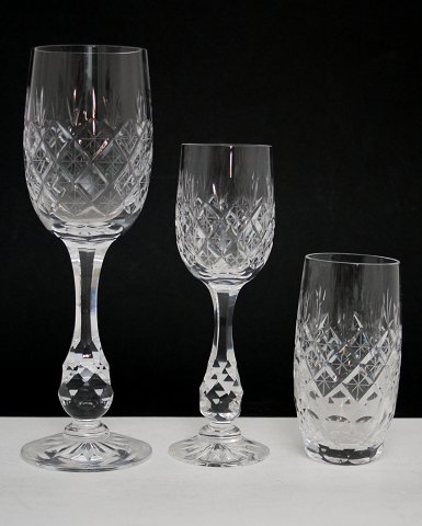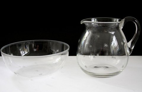 Karaffel med hvid emaljebemalet vinranke. Sorte pletter i bemalingen. Knækket i bund. Højde 23,5 cm. Pris: SOLGT