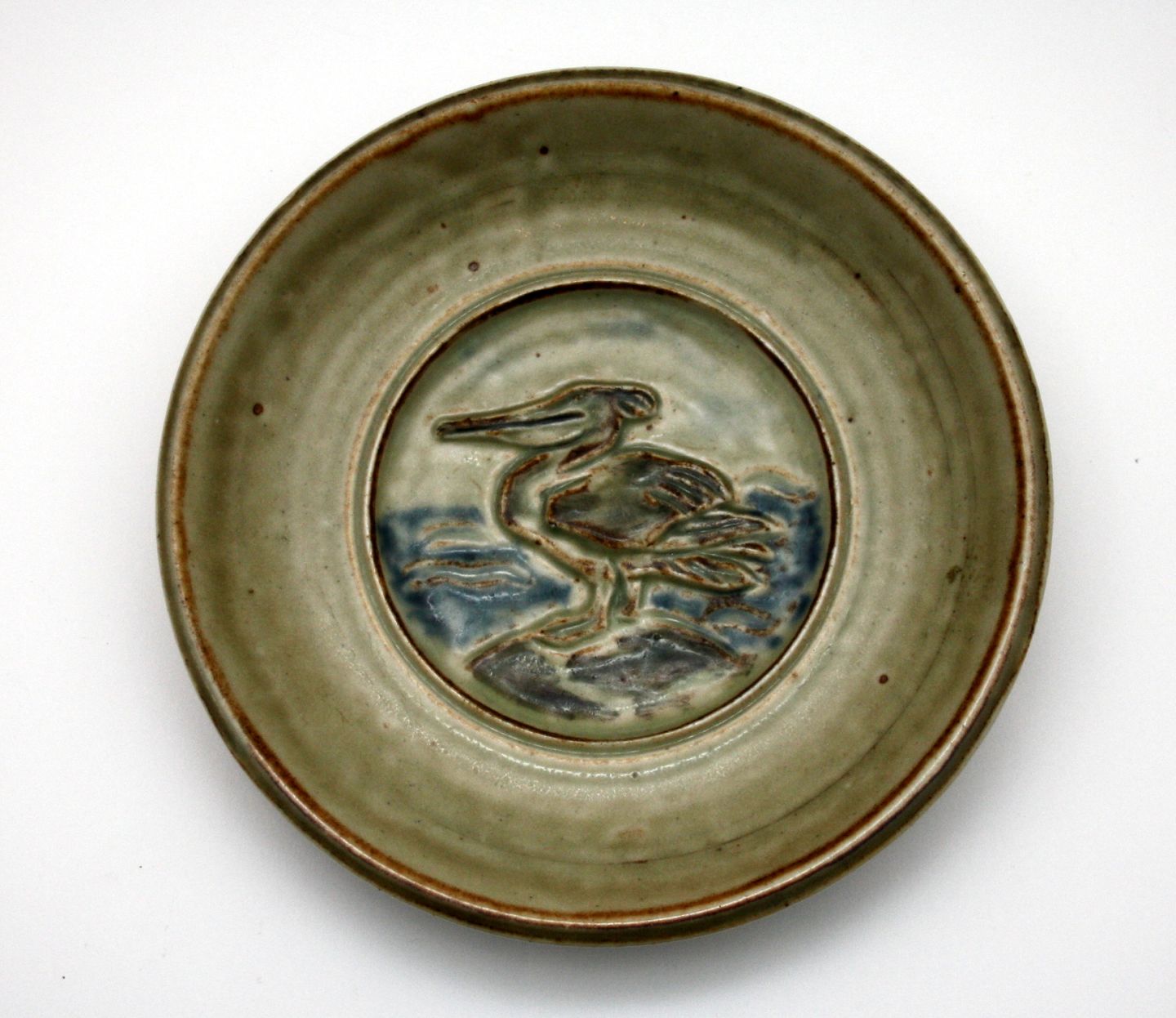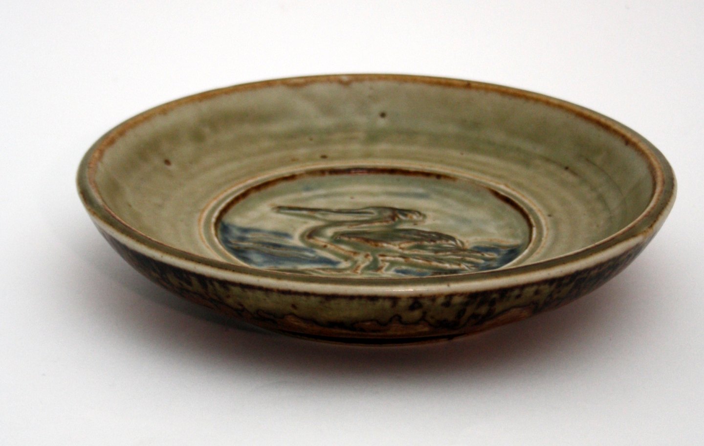 Royal Copenhagen, stentøj, rundt fad med pelikan designet af Knud Kyhn. Formnr. 21216. Diameter 19,5 cm. Højde 3,7 cm. I. sortering. Pris: 325 kr.