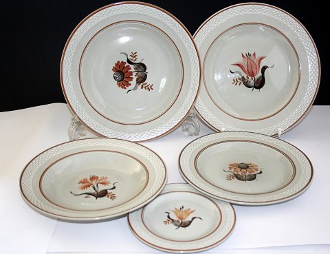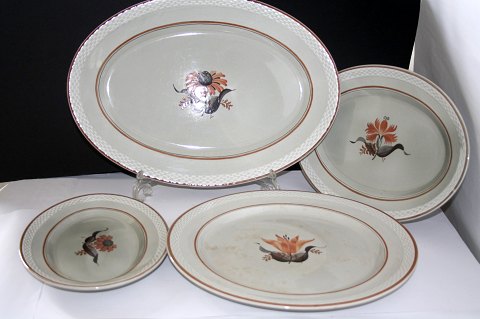 Aluminia, Kirsten dek.nr. 263. Grå fajance med brune kanter og 3 forskellige håndmalede blomster. Stellet er produceret i perioden 1933-67 og er designet af Nils Thorsson.