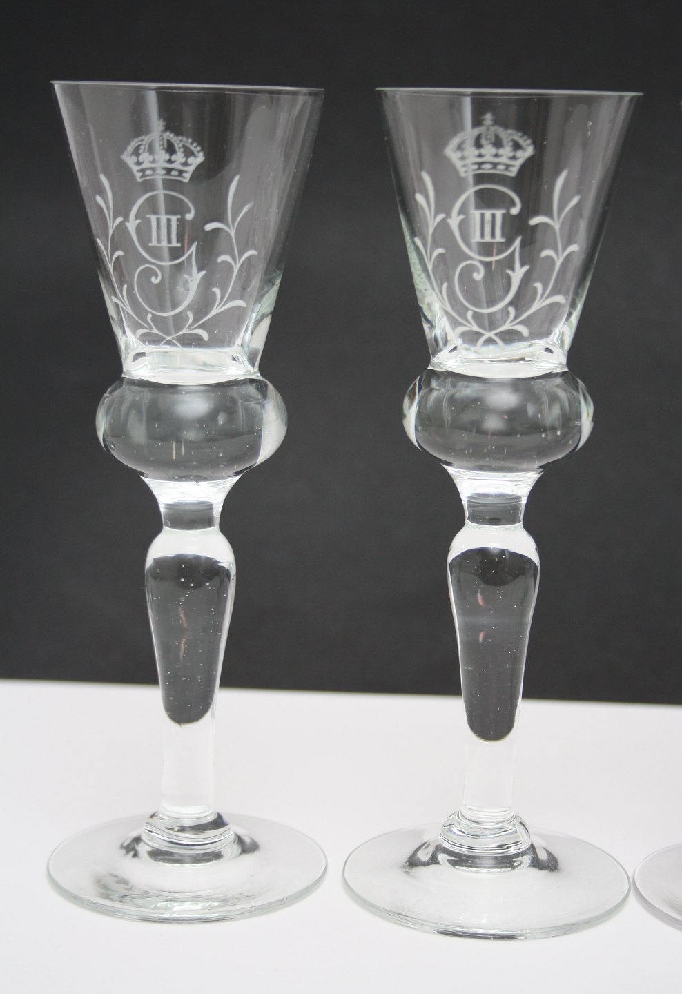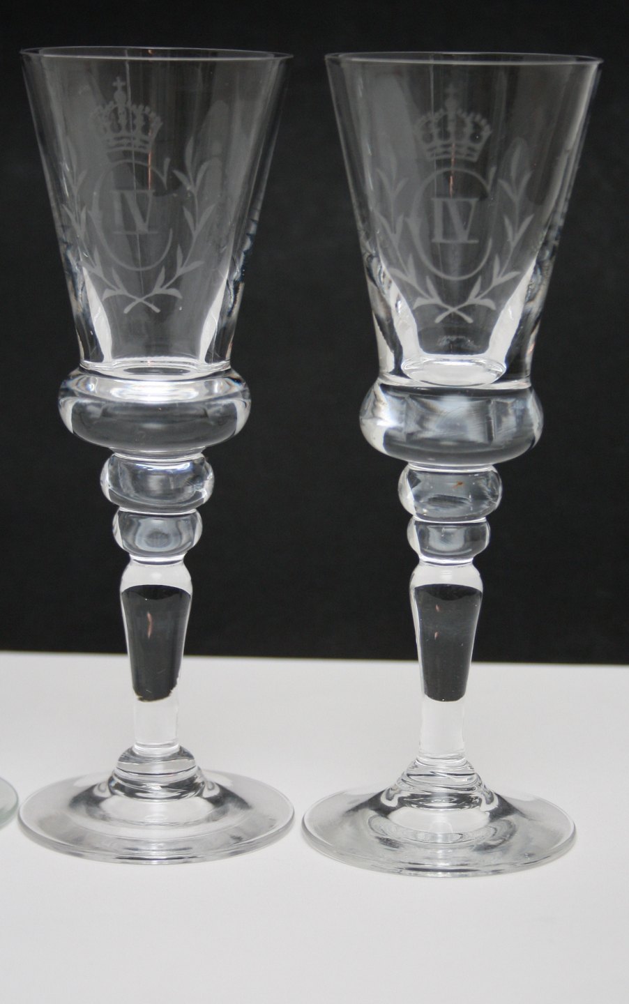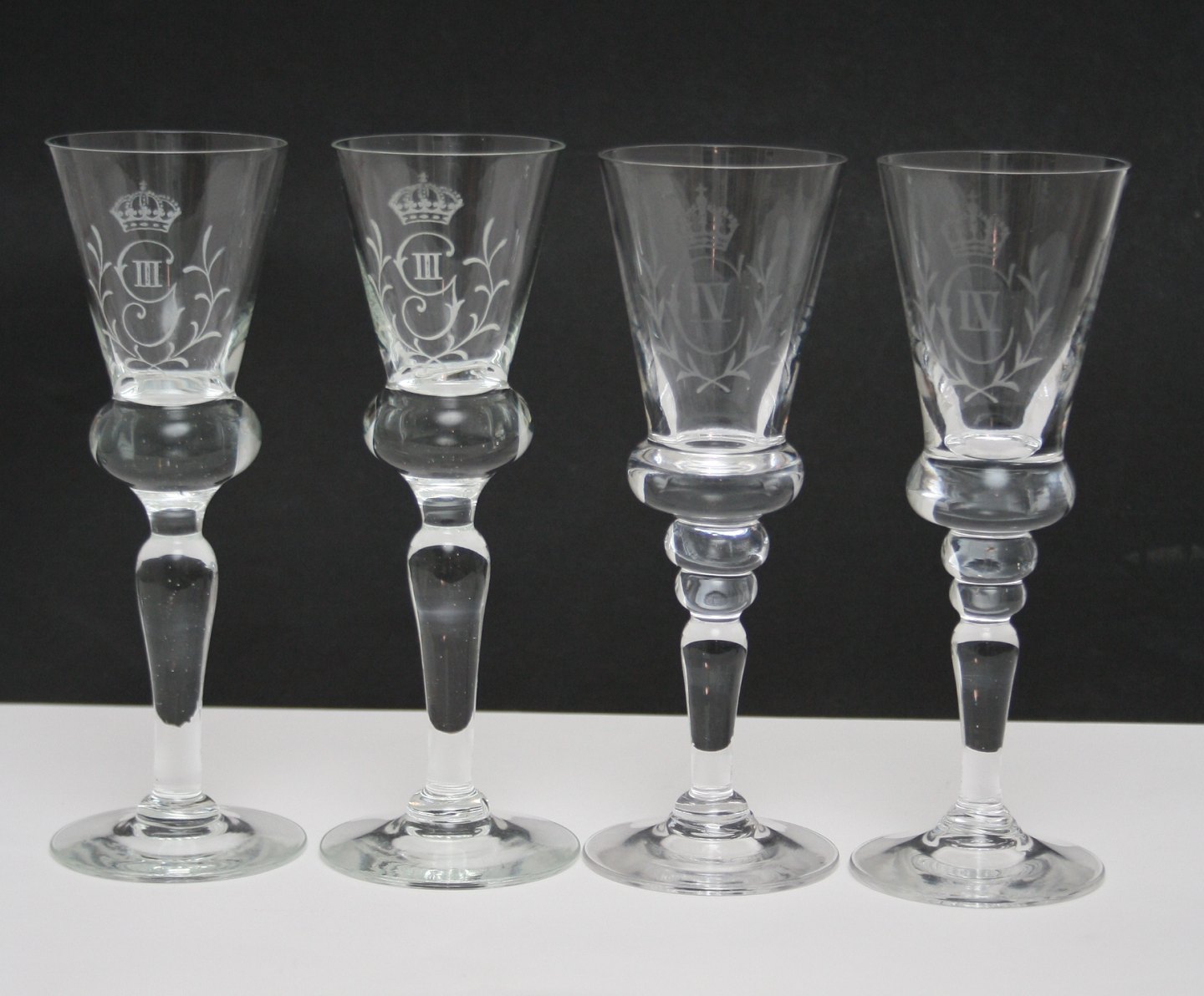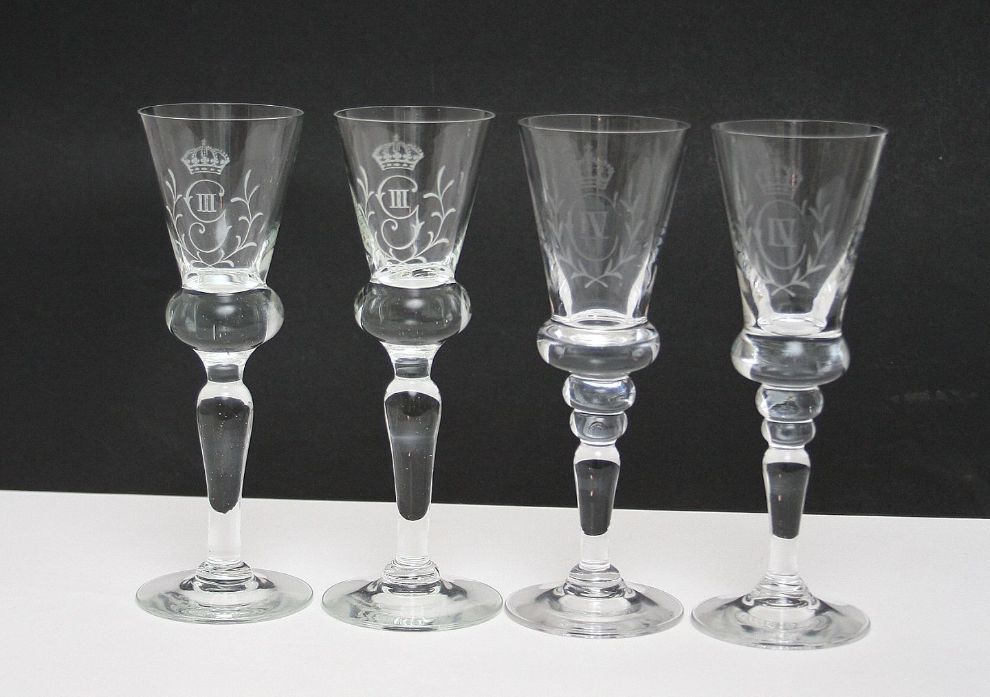 Snapseglas med Gustav III og Christian IV gravering. Gustav III. Højde 16,5 cm. Pris: 150 kr. stk. Lager: 2 Christian IV. Højde 16 cm. Pris: SOLGT