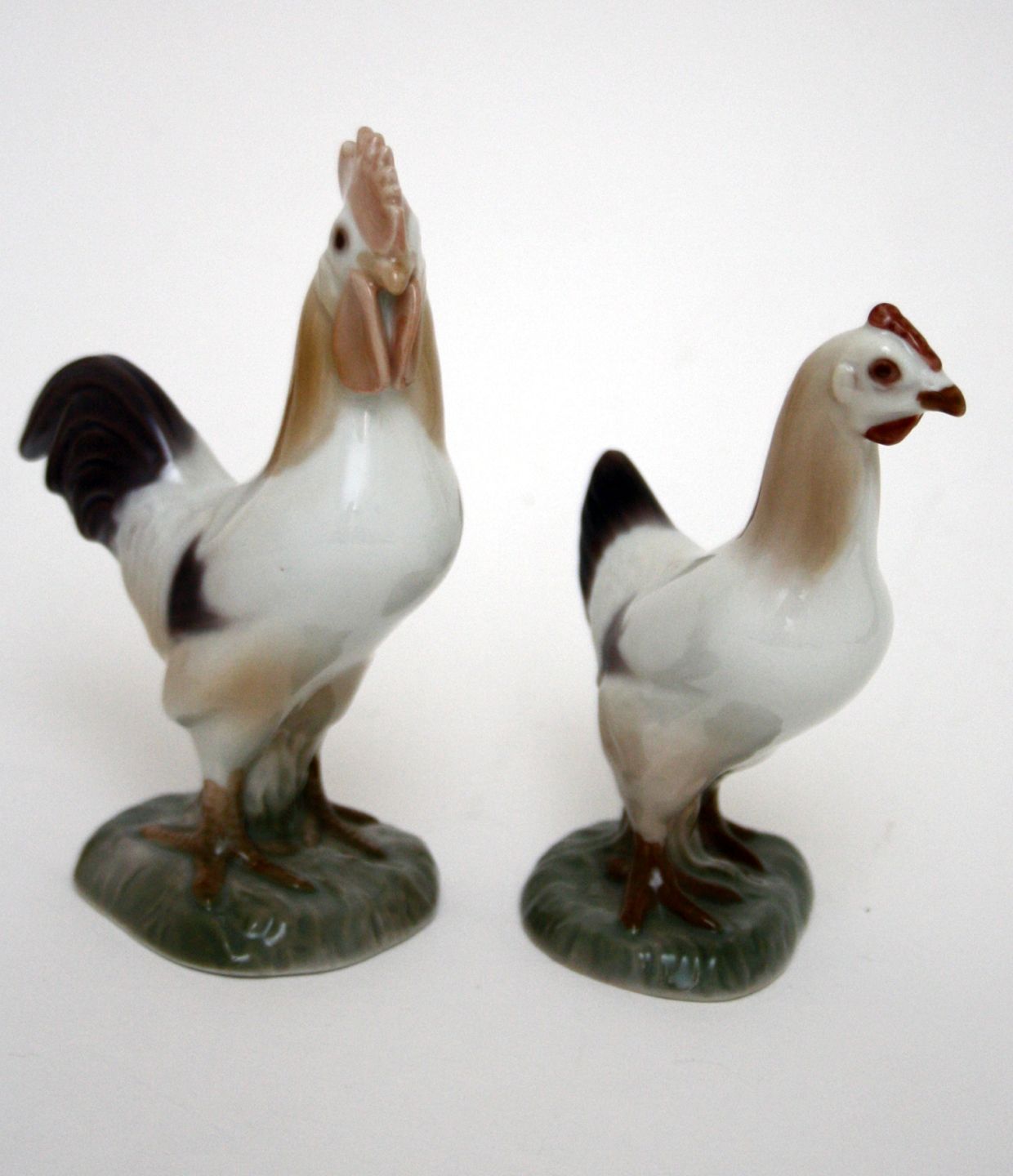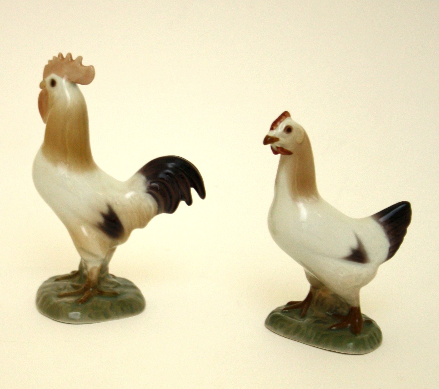 Bing & Grøndahl figurer af Svend Jespersen. Høne. Formnr. 2193. Højde 10,5 cm. I. sortering. Pris: 375 kr. Hane. Formnr. 2192. Højde 12,5 cm. I. sortering. Pris: SOLGT