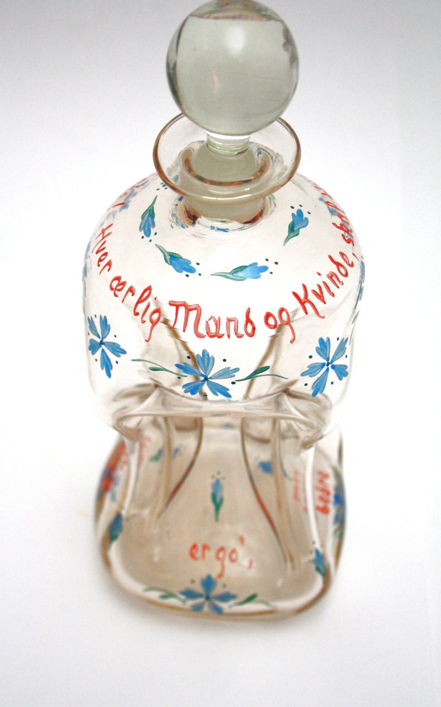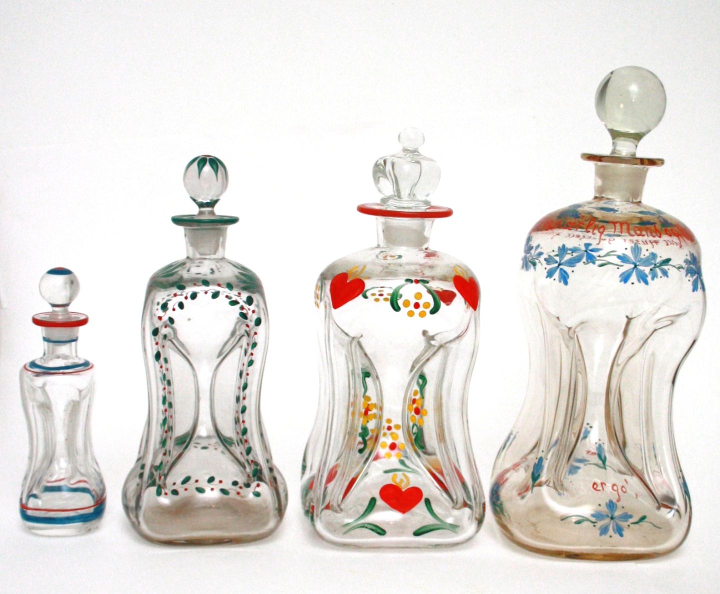 Holmegaard, Emaljedekorerede klukflasker designet af Jacob E Bang. Fra malerstuen i Nyhavn fra 1937-1957.