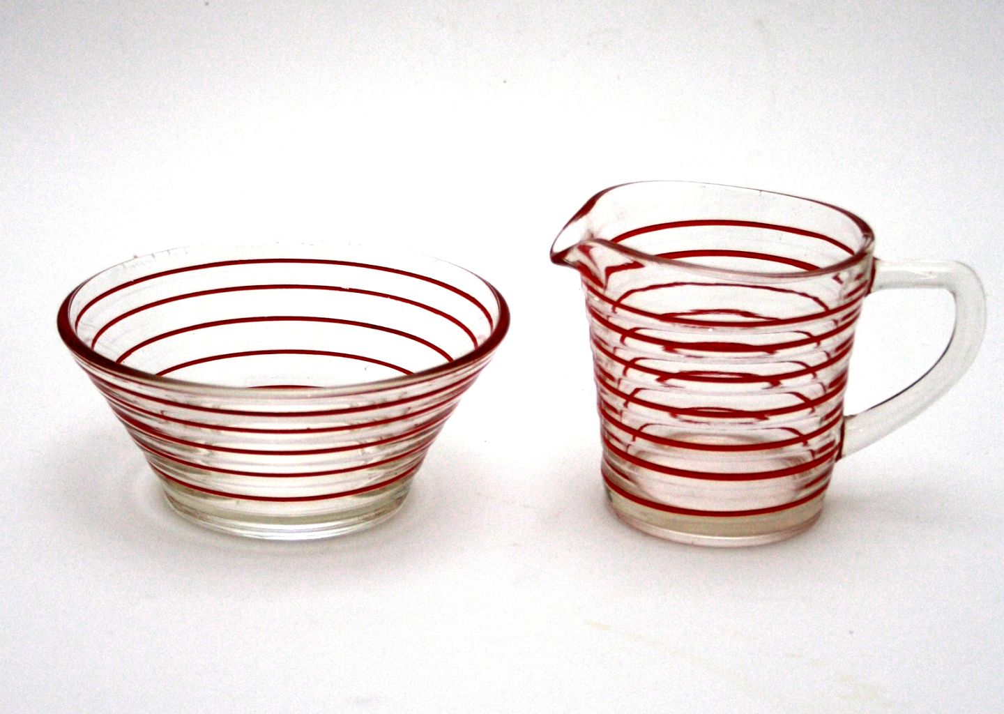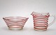 Holmegaard, Broksø klar presset glas med røde striber, designet af Jacob E Bang. Flødekande. Højde 8 cm. Pris: 175 kr. stk. Lager: 1