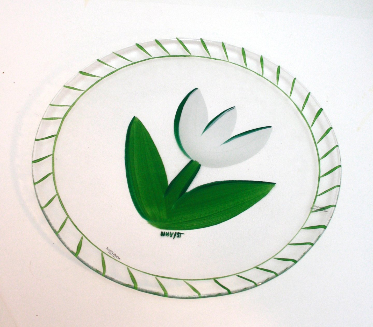 Kosta Boda, Tulipa fad klart glas med hvid tulipan. Designet af Ulrica Hydman-Vallien. Diameter 32,5 cm. Pris: 325 kr. stk.