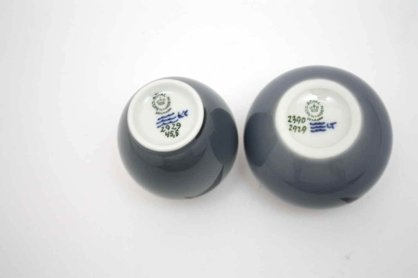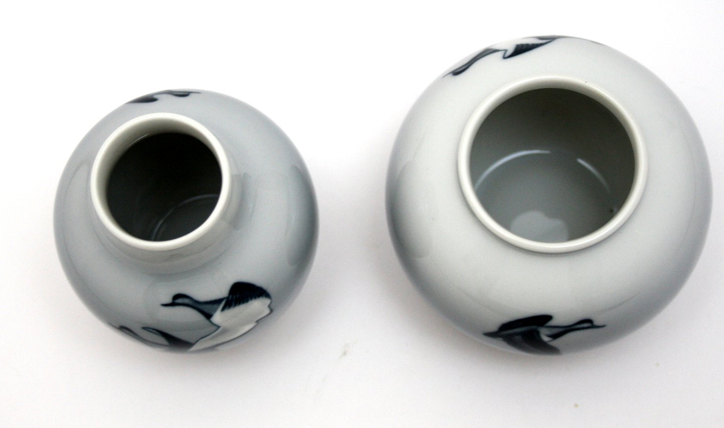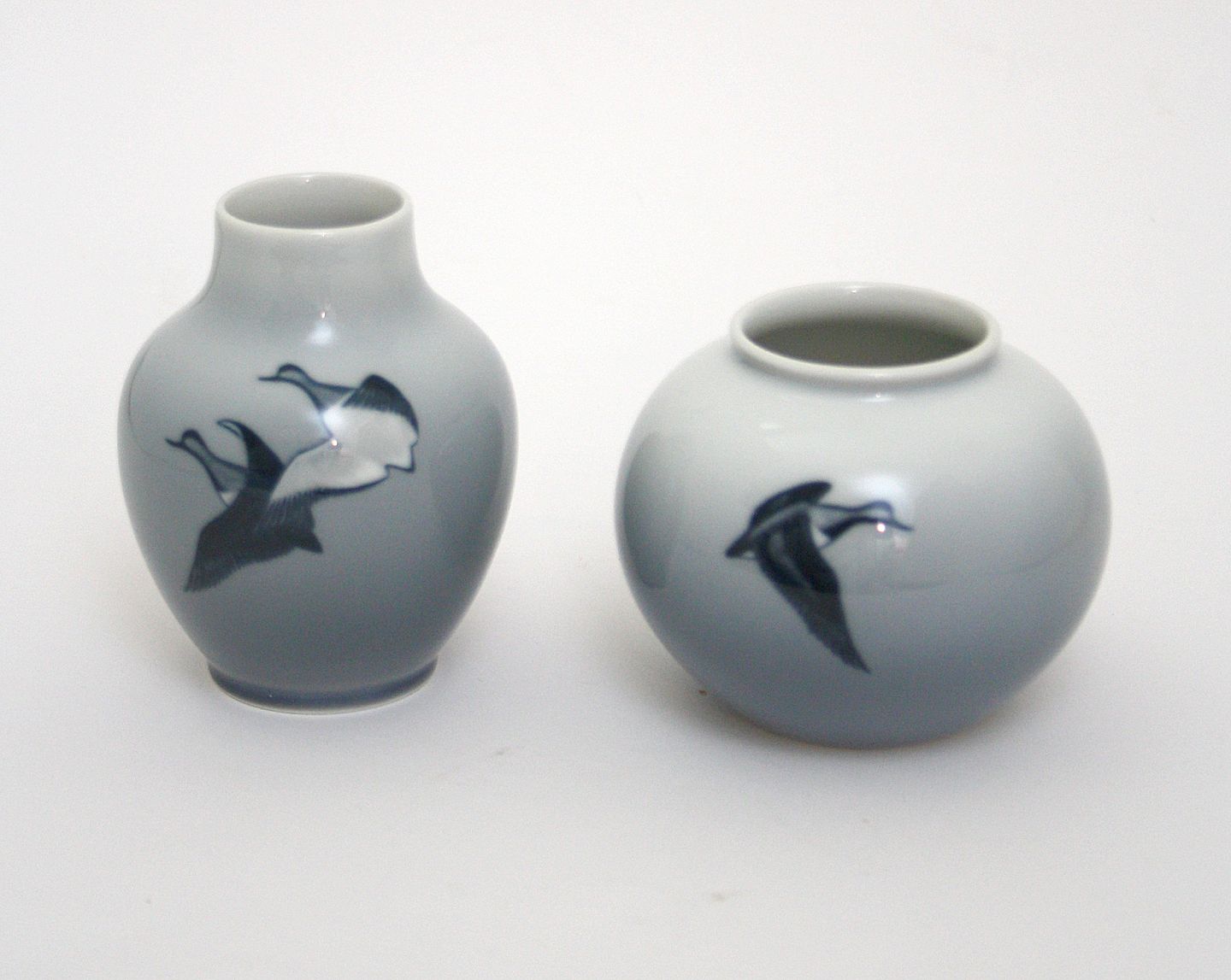 Royal Copenhagen, Flyvende fugle, vaser designet af Andy Li Jørgensen. I. sortering. Originalæsker medfølger. Tv. Vase. Formnr. 2929/45,5. Højde 10 cm. Pris: 175 kr. Th. Kuglevase. Formnr. 2390/2929. Højde 8 cm. Pris: 175 kr.