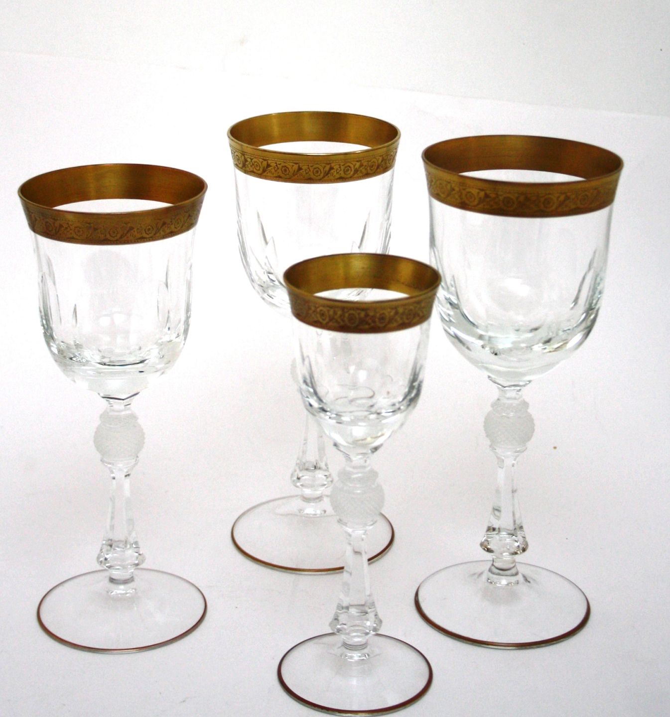 Bohemia, Jessie 24 % håndslebne krystal glas med 14 karat guldbort med cisseleringer udenpå og glat indvendig. Kumme med oliveslibning, facetslebet stilk med rund slebet knop. Eksklusivt bøhmisk glas produceret i området omkring Prag. Glassene er fra slut 1970'erne til starten af 1980'erne og i flot stand.