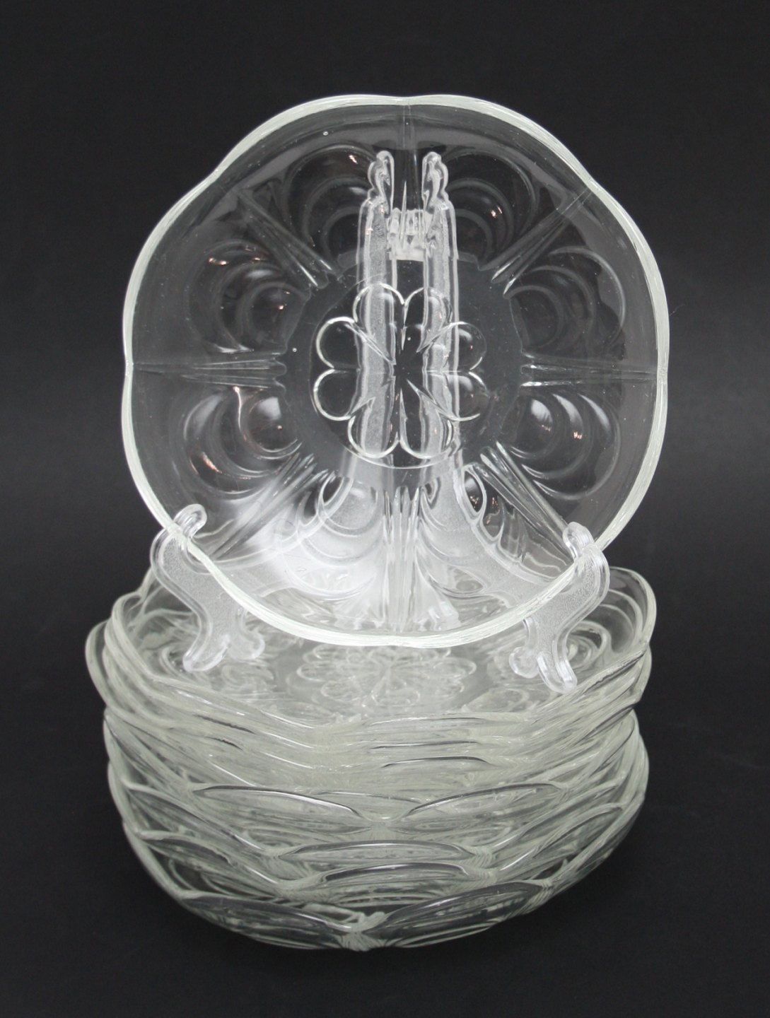Fyens Glasværk/Kastrup Glasværk, Nanna. Klart presset glas fra 1934 og frem. Isassiet. Diameter 16 cm. Højde 2,5 cm. Pris: 40 kr. stk. Lager: 8