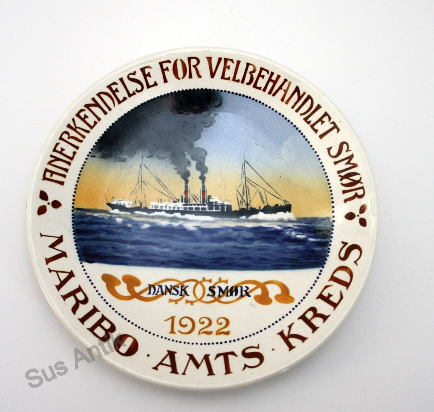 Aluminia, Mejeriplatte, Anerkendelse for velbehandlet smør. Maribo Amts Kreds 1922. Stemplet Kjøbenhavns Fajancefabrik Danmark. Luftmalet dekoration efter tegning af Oscar Willerup.