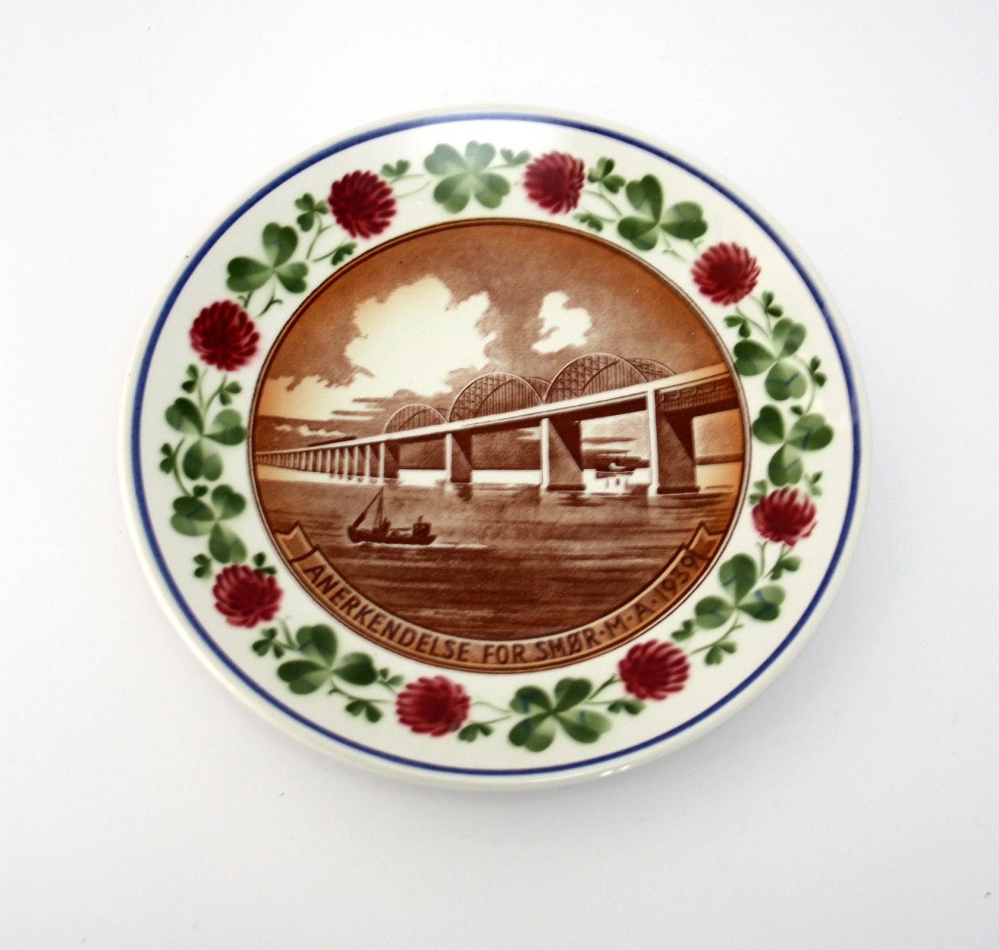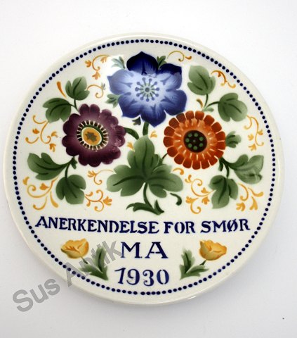 Aluminia. Mejeriplatte, Anerkendelse for velbehandlet smør. Maribo Amts Kreds 1939. Luftmalet dekoration efter tegning af Oscar Willerup.