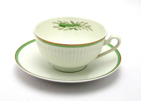 Royal Copenhagen, Grøn Melodi designet af Thorkild Olsen i 1950'erne. Hvidt riflet stel med guldkant og motiver i grønt. Dekorationsnr. 1513. Dyb frokosttallerken stor. Formnr. 14062. Diameter 23 cm. I. sortering. Pris: 150 kr. stk. Lager: 22