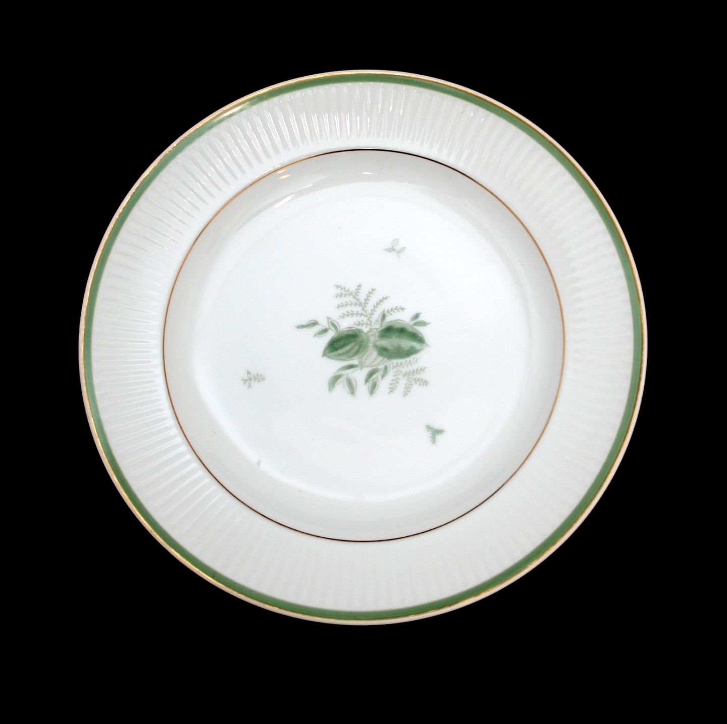 Royal Copenhagen, Grøn Melodi designet af Thorkild Olsen i 1950'erne. Hvidt riflet stel med guldkant og motiver i grønt. Dekorationsnr. 1513. Frokosttallerken, stor. Formnr. 14061. Diameter 23 cm. I. sortering. Pris: 150 kr. stk. Lager: 10