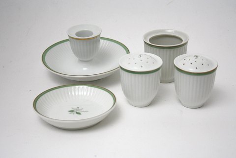 Royal Copenhagen, Grøn Melodi designet af Thorkild Olsen i 1950'erne. Hvidt riflet stel med guldkant og motiver i grønt. Dekorationsnr. 1513.