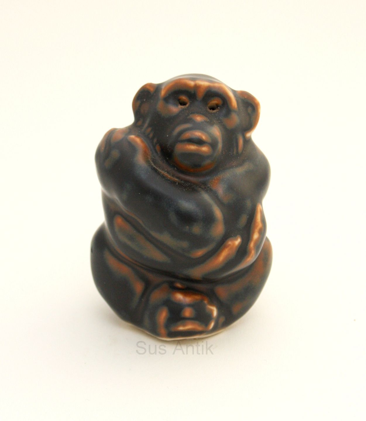 Royal Copenhagen, stoneware brun glasur. Abe siddende med armene om sig. Formgivet af Knud Kyhn. Nr. 20188. Højde 8,5 cm. Pris: 550 kr.