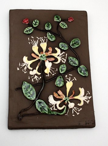 Jie-Keramik, Sweden, Relief med Kaprifolie. Formnr. 789. 23 x 15 cm. Pris: SOLGT Jie-Keramik grundlagt af John Ewart Johnson i 1952, i 1967 blev Aimo Nietosvuori tilknyttet som kunstner.