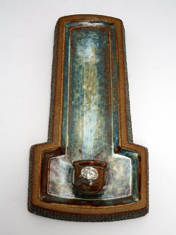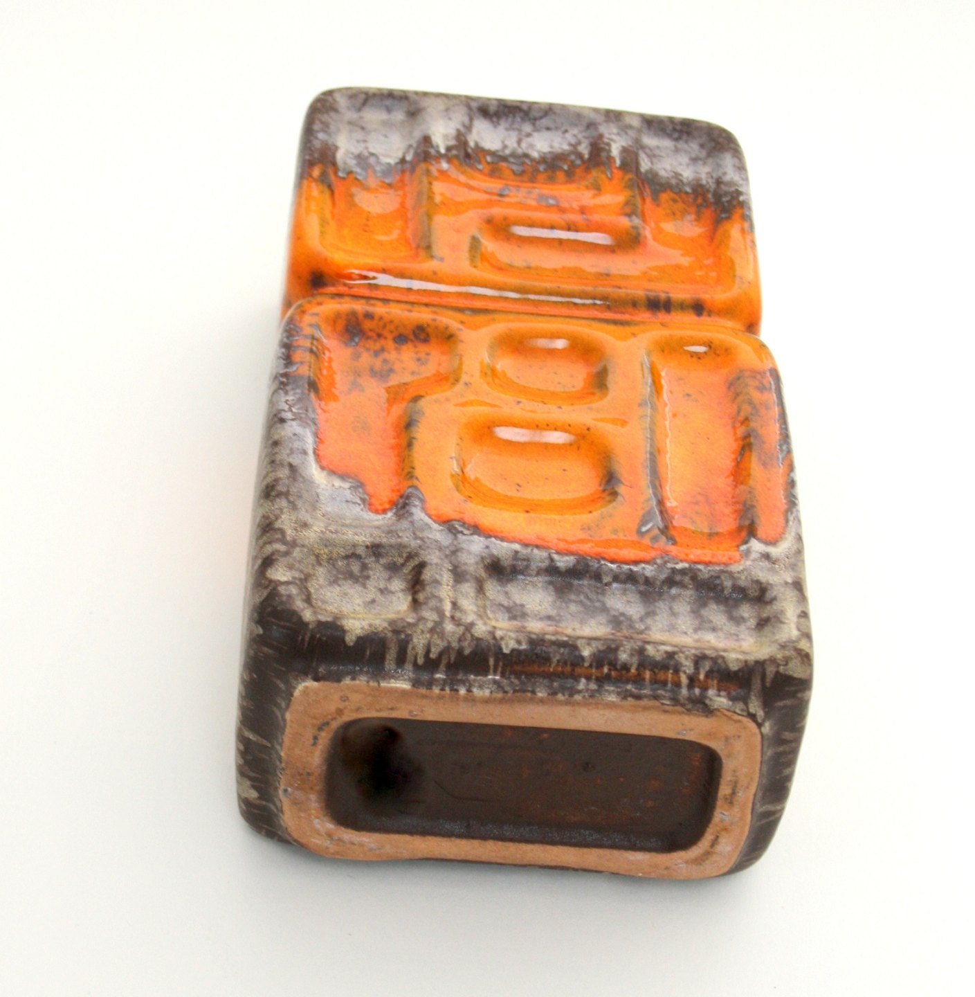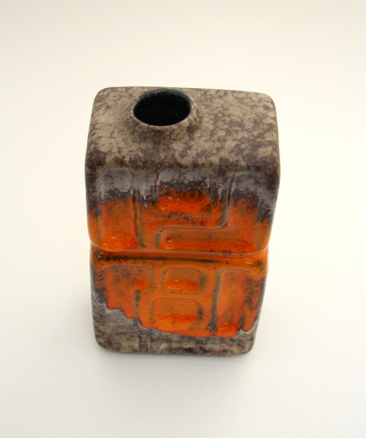 Strehla, West Germany. Firkantet vase i brunmeleret mat glasur med relief mønster og orange glasur. Højde 21 cm. 10 x 7 cm. Pris: SOLGT