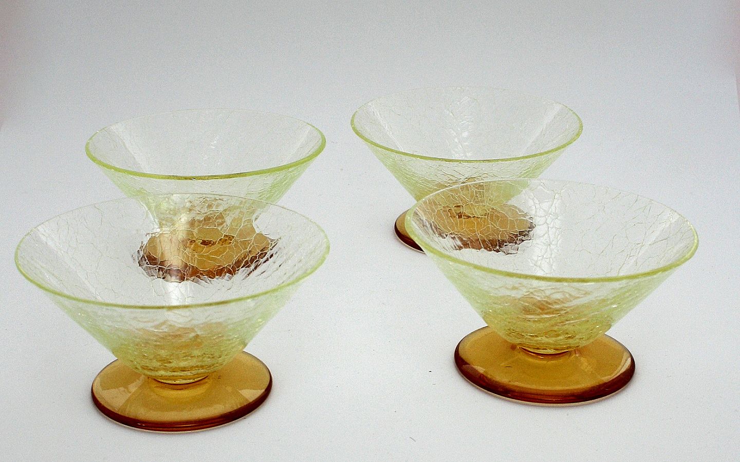 Lysegul craquelé skål med rav farvet fod. Kan bruges til cocktail, champagne, is eller portionsskål. Højde 5,7 cm. Diameter 11 cm. Sælges samlet. Pris: SOLGT