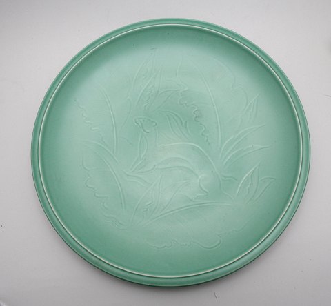 Oval skål i creme mat glasur med fiskemotiv. Nr. 1872/1602. Højde 10 cm. 17 x 10 cm. Pris: 350 kr.