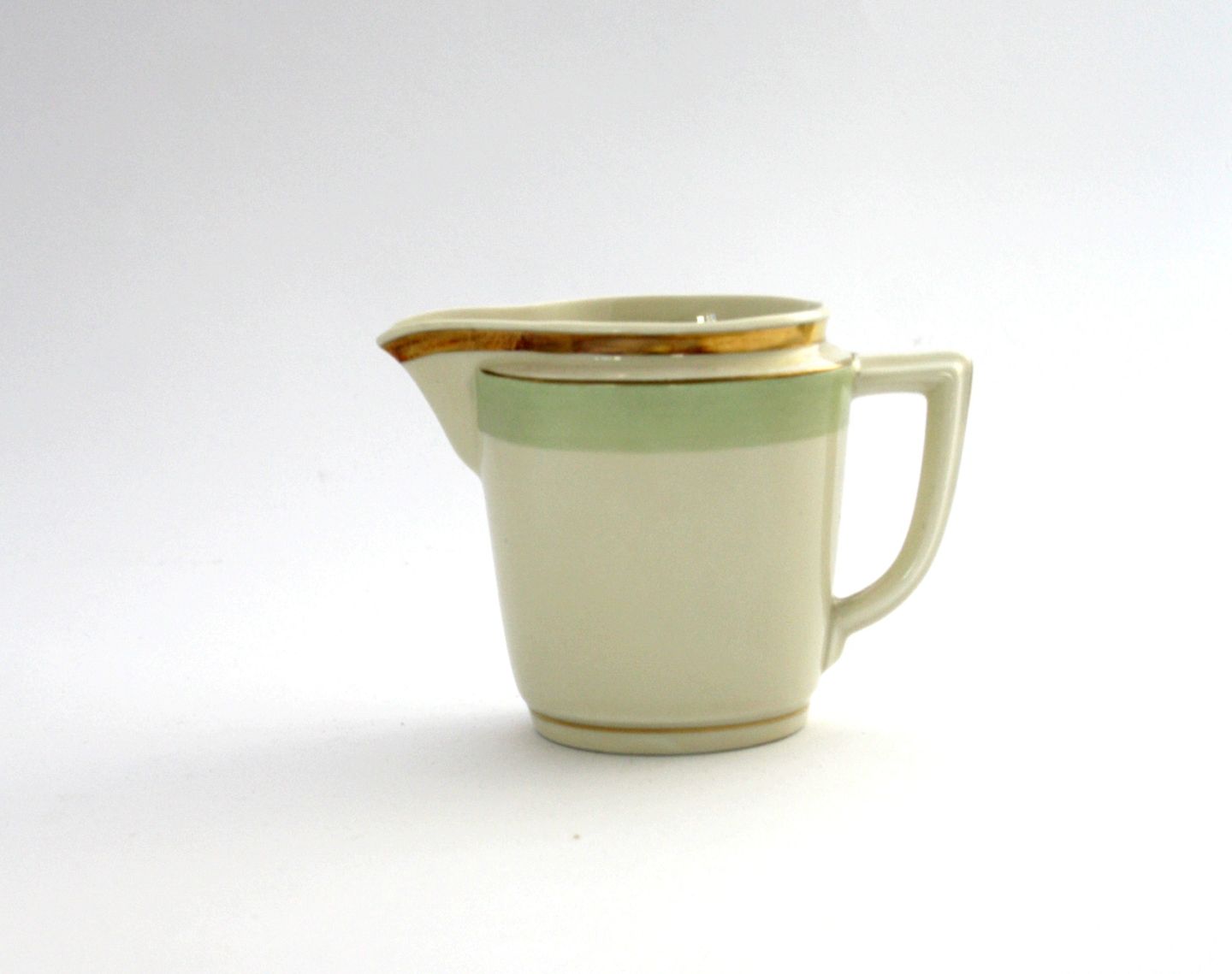 Royal Copenhagen, Broager. Cremefarvet stel med lysegrøn bort og guldkanter. Flødekande. Nr.1236/9726. Højde 7,5 cm. Diameter 6,6 cm. II. sortering. Pris: 150 kr. stk. Lager: 1