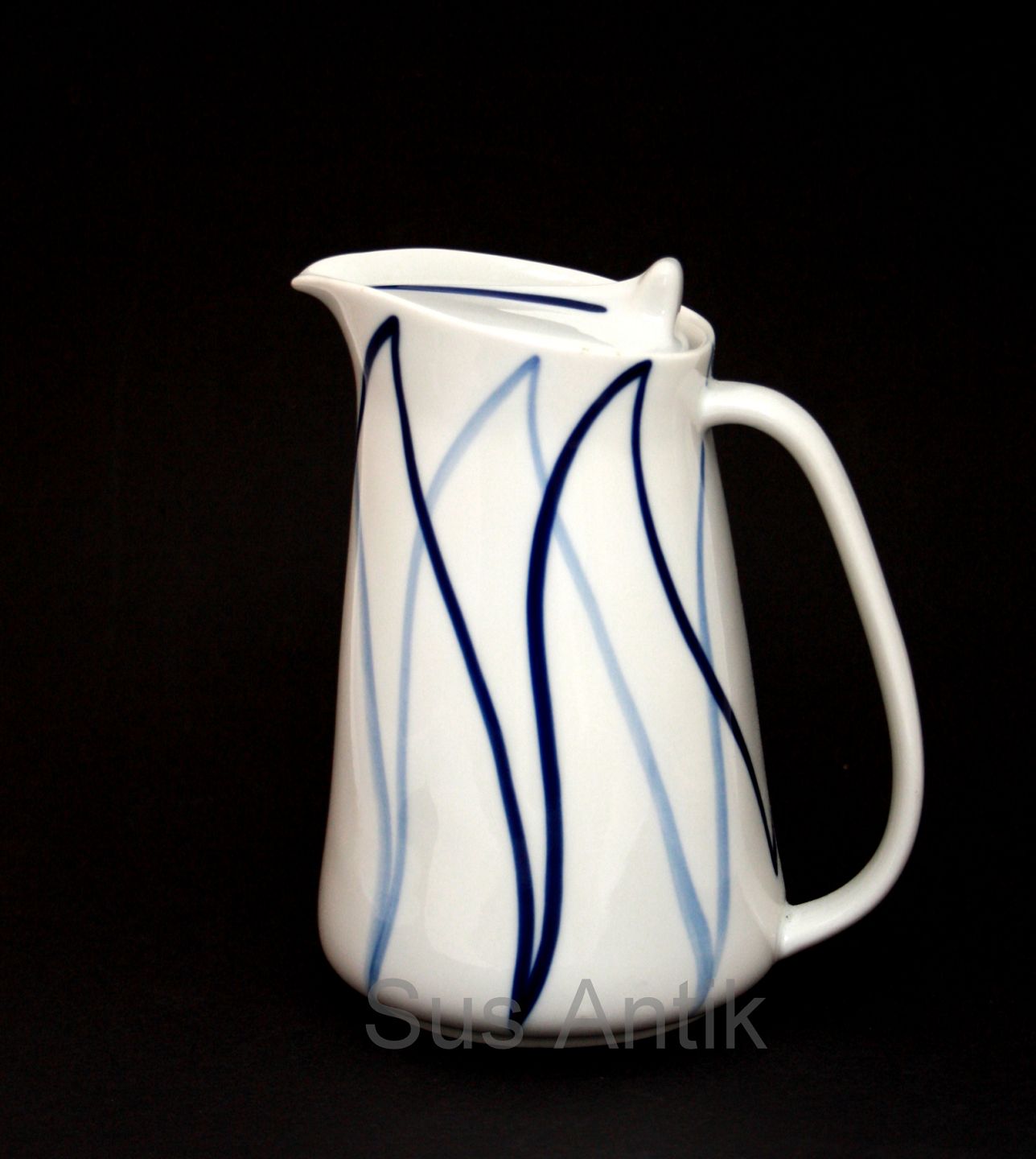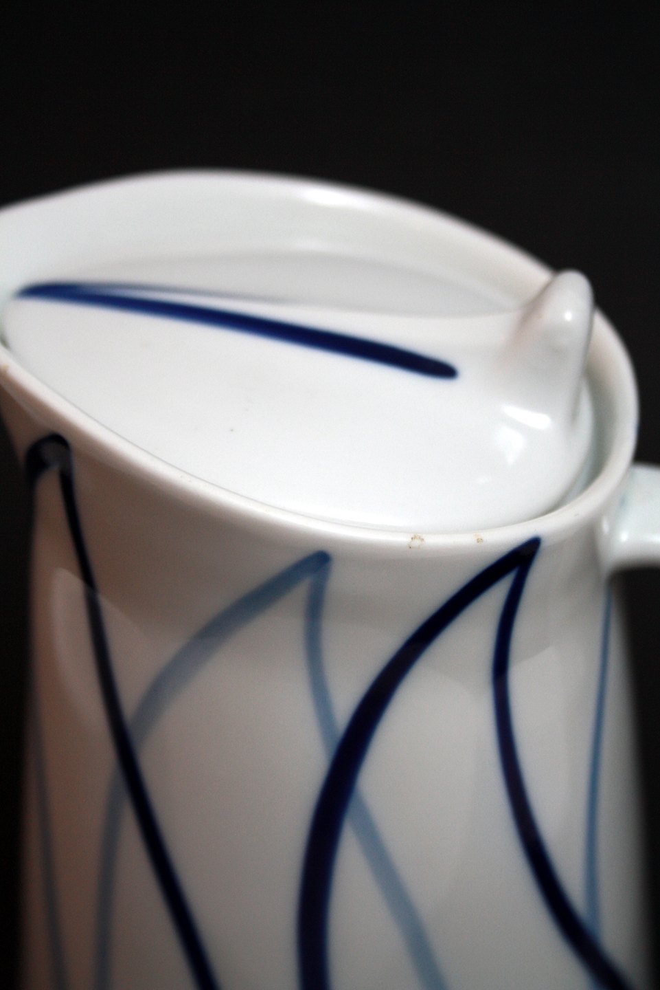 Harlekin/Blå flamme Dan-ild Lyngby. Design Axel Brüel i 1958. Ildfast porcelæn blev solgt under sloganet fra ild til bord. Chokoladekande. Højde 16,5 cm. Mikroskopisk afslag på øverste kant se ekstra foto. Pris 300 kr.