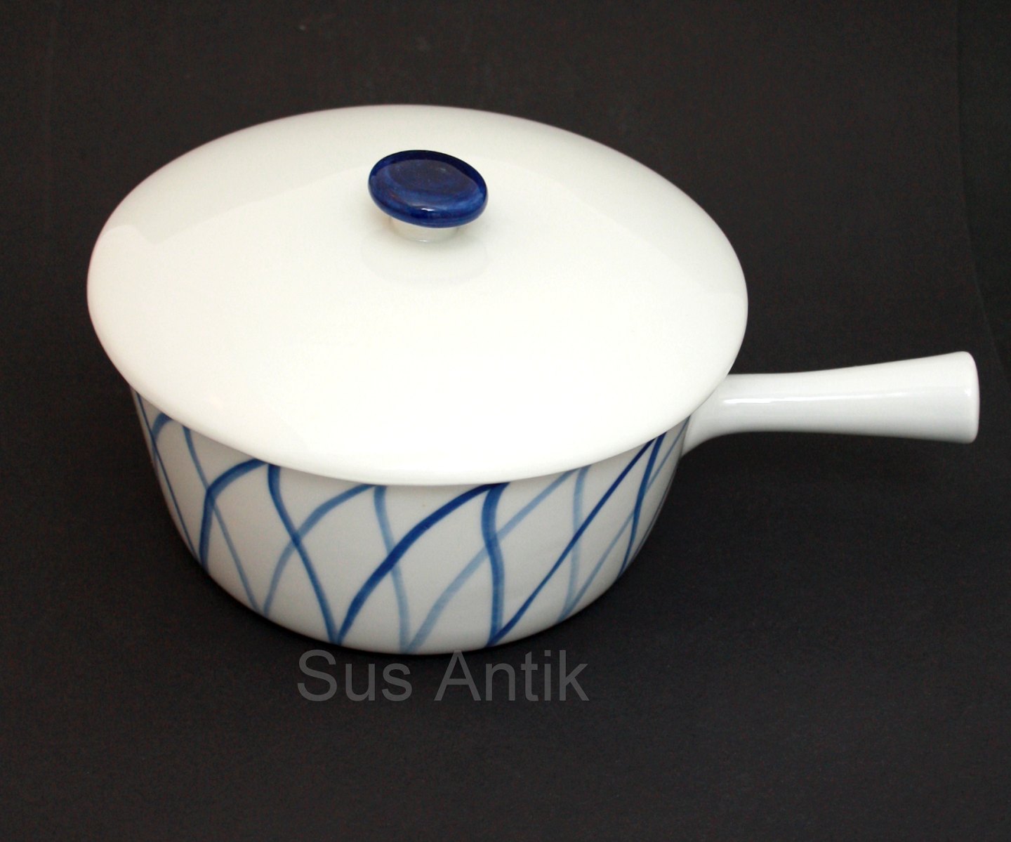 Lyngby, Dan-Ild, Harlekin/Blå flamme, Design Axel Brüel i 1958. Ildfast porcelæn blev solgt under sloganet fra ild til bord. Stor kasserolle med låg. Højde 12 cm. Diameter 18,5 cm. Pris: 300 kr. stk. Lager: 1