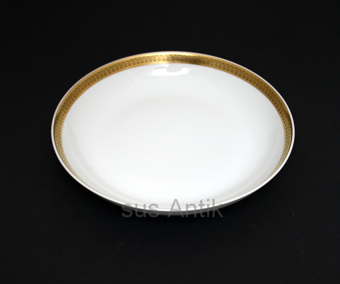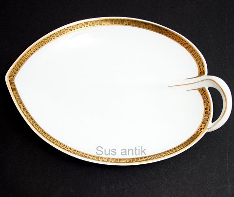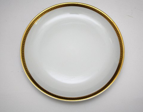 Lyngby, Danmark, Trend 450. Hvidt stel med græsk guldbort. Lav skål. Højde 3,5 cm. Diameter 20,5 cm. Pris: 175 kr. stk. Lager: 1