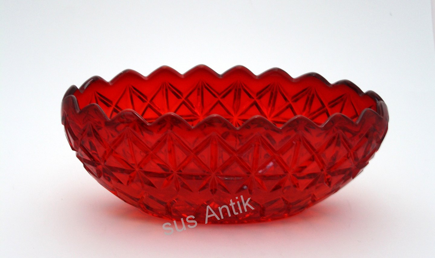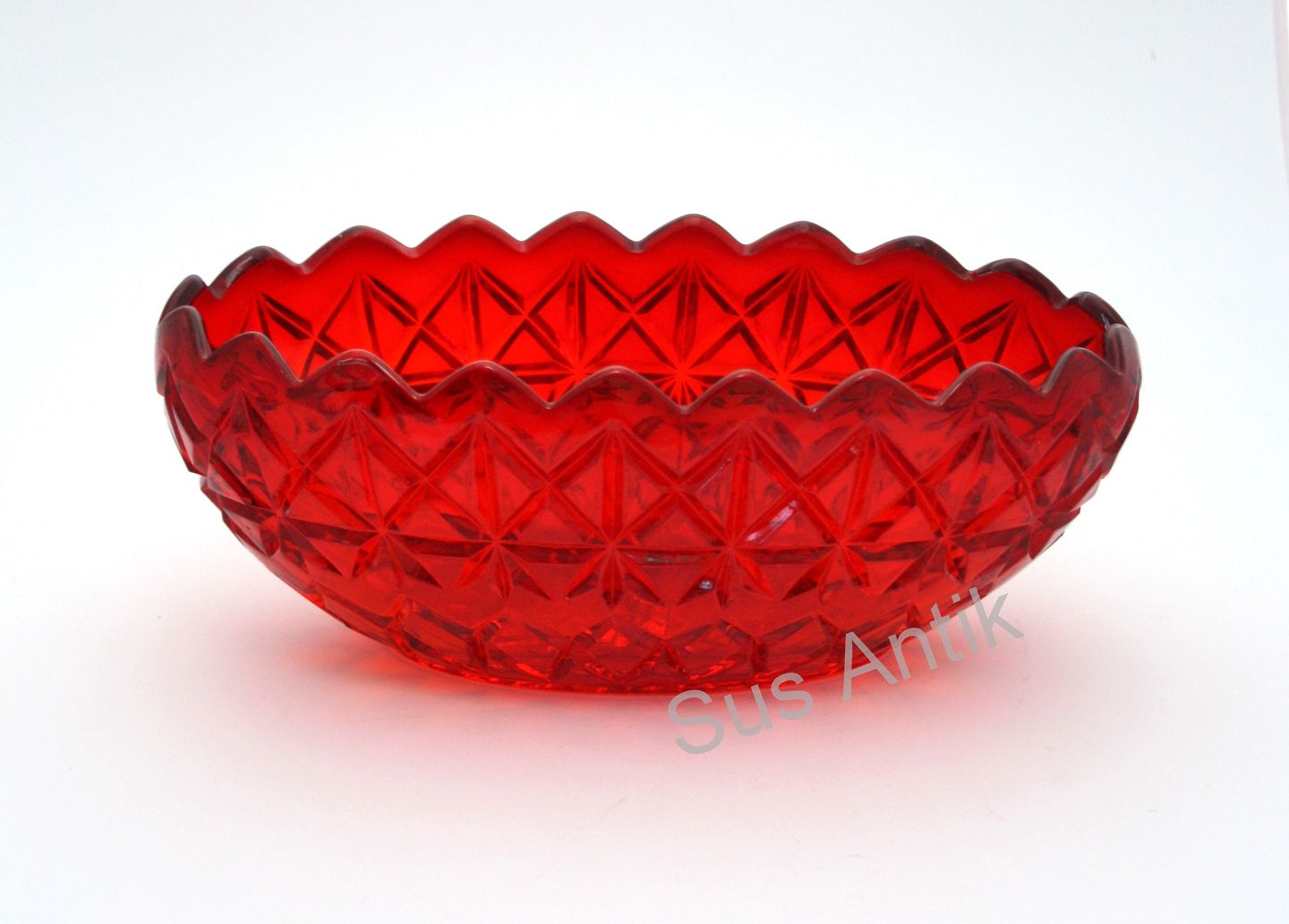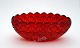 Fyens Glasværk, Rubinrød presset glas med krydsslibning. Produceret fra 1924 og frem. Jardiniere (oval skål). Længde 23 cm. Bredde 12 cm. Højde 9 cm. Pris: 425 kr. stk. Lager: 2