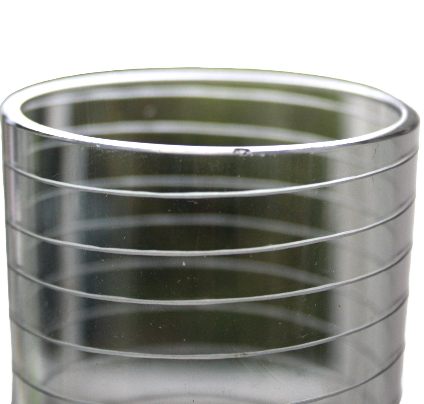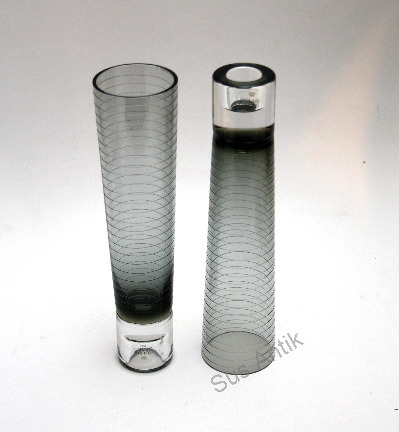 Holmegaard, Groove vendbare vaser og lysestager, smokefarvet med vandrette striber. Designet af Rikke Hagen 2004. Højde 22,5 cm. Vase diameter 5,5 cm. Lysestage diameter 4 cm. Pris: 150 kr. stk. Lager: 2