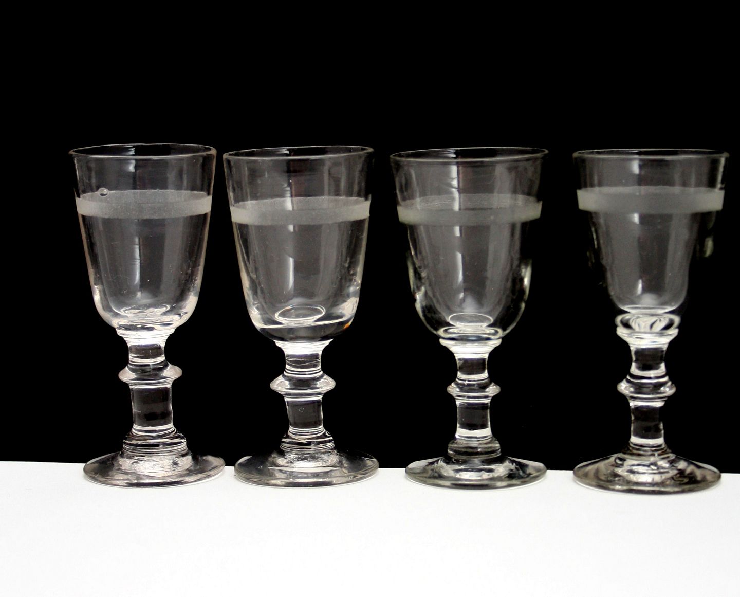 Berlinois snapseglas med slebet bånd. Omkring år 1900. Knækket i bund. Højde ca. 8,2 cm. Sælges samlet. Pris: 250 kr. for sættet på 4