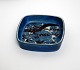 Royal Copenhagen, Baca Kunstfajance, Blåt fad/skål. Designet af Jonna Gerber. Nr. 780-2882. 11 x 11 cm. Højde ca. 2,5 cm. Arkivfoto. Denne er III. sortering (medarbejdersortering). Pris: 175 kr. stk. Lager: 1
