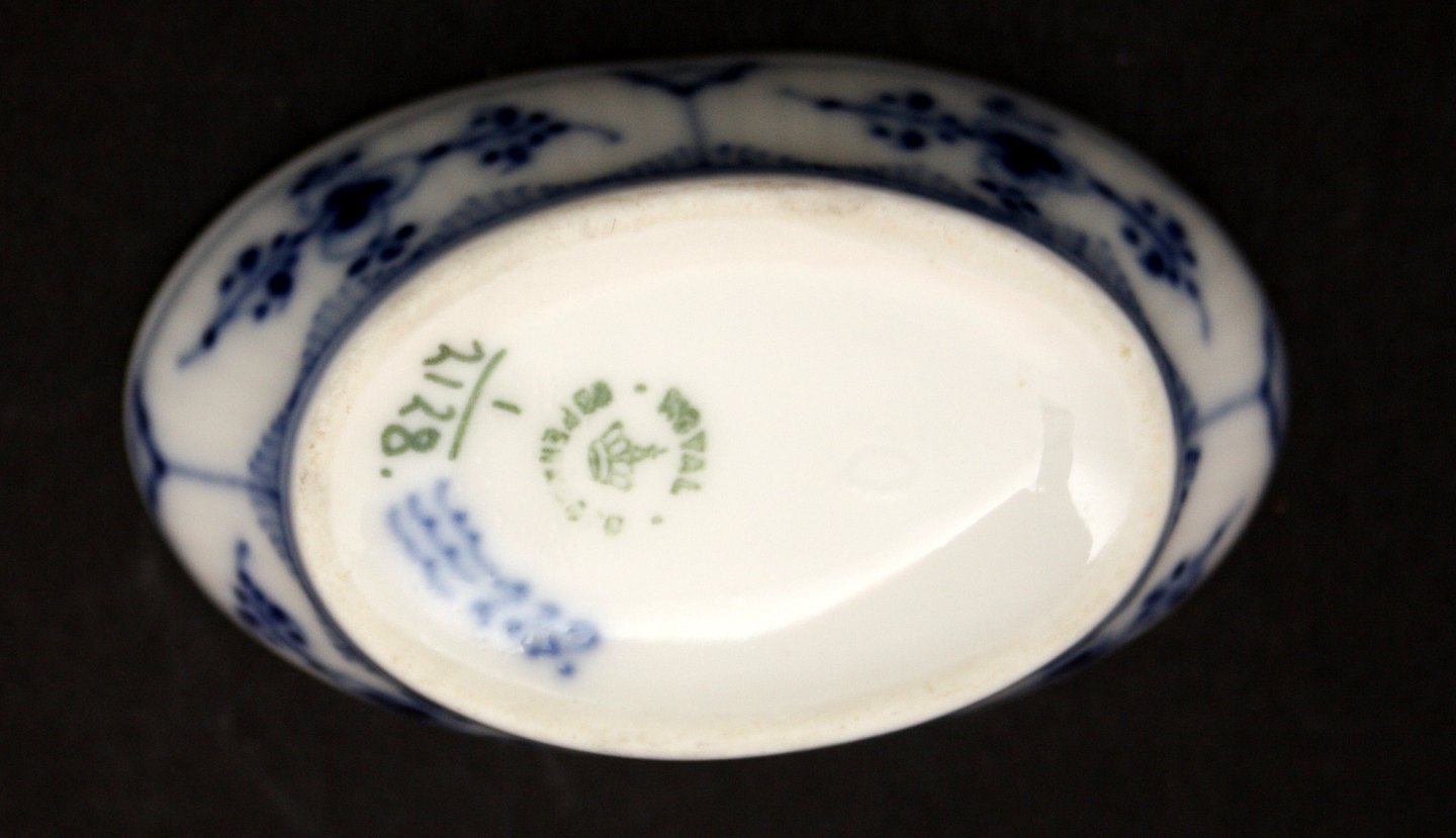 Royal Copenhagen, Musselmalet riflet, Saltkar. Nr. 1/2128. Længde 7 cm. Bredde 4 cm. Højde 2 cm. I. sortering. Flot stand. Pris: 425 kr.